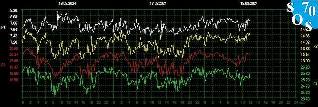 Wenn du dir die Diagramme ansiehst, findest du am oberen Rand die Datumsangaben, die von links nach rechts verlaufen – das neueste Datum ist immer rechts zu sehen. Diese Struktur hilft dabei, die zeitliche Entwicklung der Resonanzen im Blick zu behalten. Am unteren Rand des Diagramms findest du die Zeiten, die in einer Sequenz von 0 bis 24 Stunden angegeben sind. Die Zeiten basieren auf der lokalen Zeit in Tomsk, Sibirien (GMT+7). Um diese Zeiten mit deiner eigenen Zeitzone abzugleichen, musst du einfach den Zeitunterschied berücksichtigen.